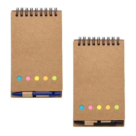 Bloco de anotações kraft com wire-o. Contém cinco blocos coloridos autoadesivos com aproximadamente 25 folhas, bloco amarelo autoadesivo com aproximadamente 25 folhas e bloco de folhas brancas pautadas com aproximadamente 70 folhas. Acompanha mini caneta de papelão com acabamentos plásticos e acionamento por clique.