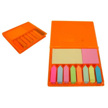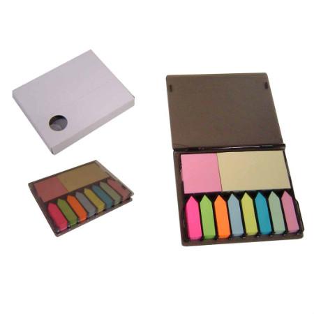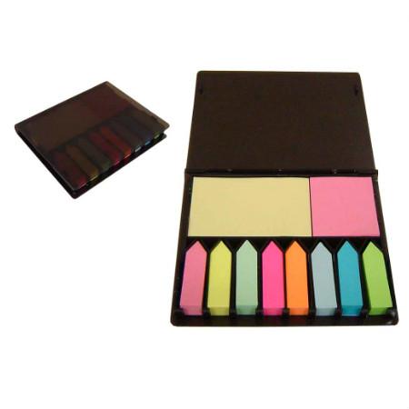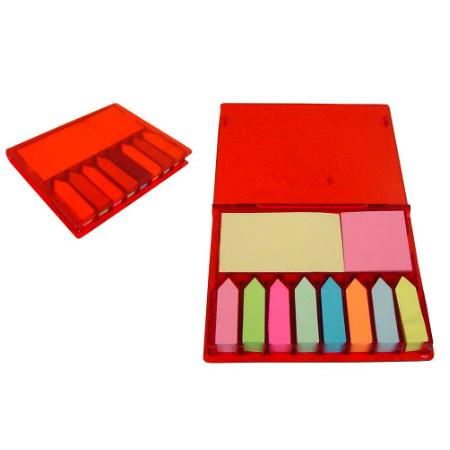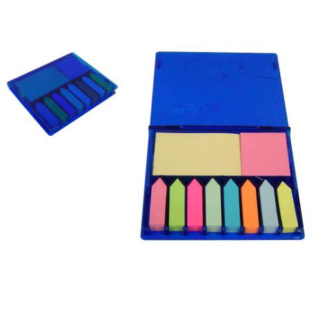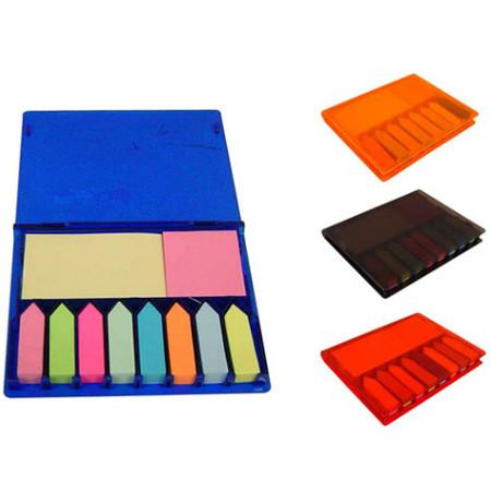 Estojo de plástico translúcido com bloco de anotações e marcadores de páginas coloridos adesivados (Post-it).