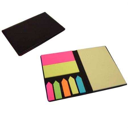 Bloco de anotações em couro sintético com papeis adesivos (post-it) coloridos.