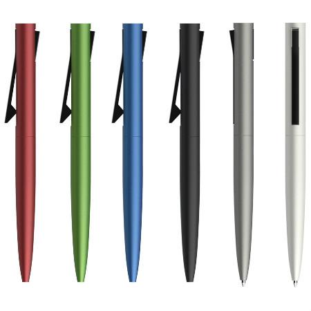 Caneta esferográfica de alumínio, carga azul e acionamento através de pressão na lateral.
