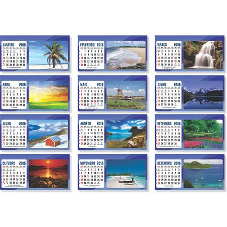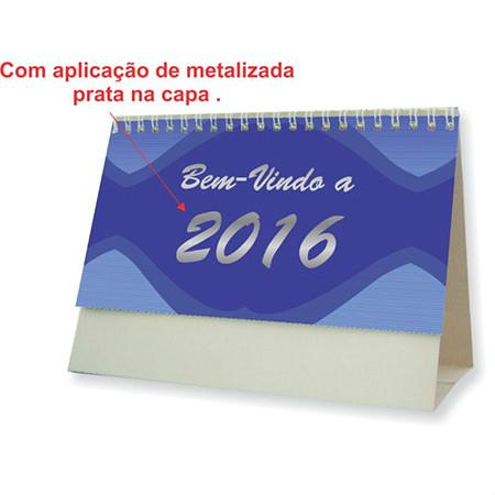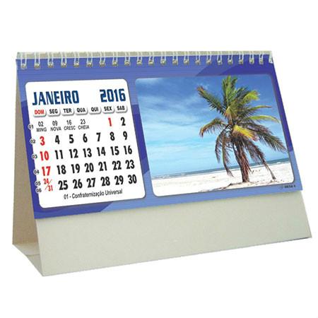 Calendário de mesa em couchê brilhante, 13 meses, estrutura em cartão Triplex e acabamento em Wire-O.