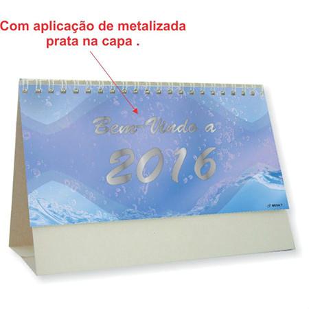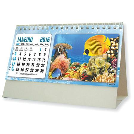 Calendário de mesa em couchê brilhante, 13 meses, estrutura em cartão Triplex e acabamento em Wire-O.
