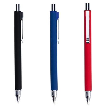 Caneta de alumínio com revestimento emborrachado. Aciona por clique. Carga esferográfica azul.