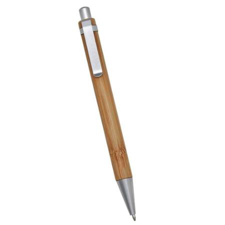 Caneta bambu com detalhes prata. Clip de metal, aciona por clique.