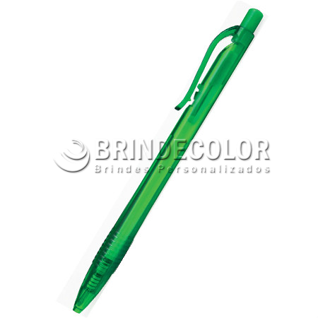 Caneta esferográfica de plástico, com corpo colorido translúcido, carga azul com 1,5 Km de escrita e acionamento através de pressão.