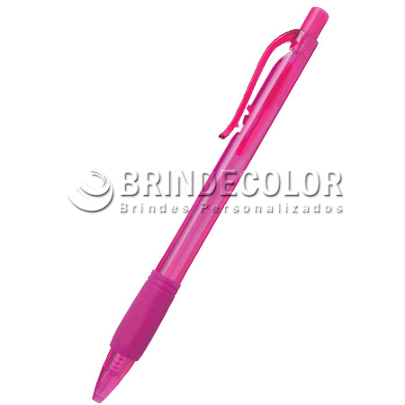 Caneta esferográfica de plástico, com corpo colorido translúcido, carga azul com 1,5 Km de escrita e acionamento através de pressão.