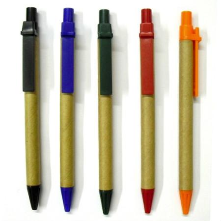 Caneta esferográfica com corpo de papelão reciclado, carga cor azul, detalhes em diversas cores (sujeito a confirmação em estoque) e acionamento através de pressão.