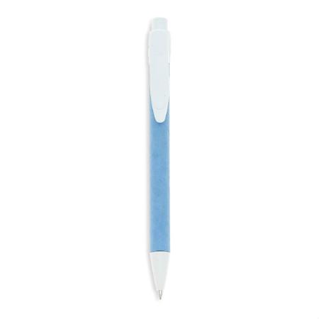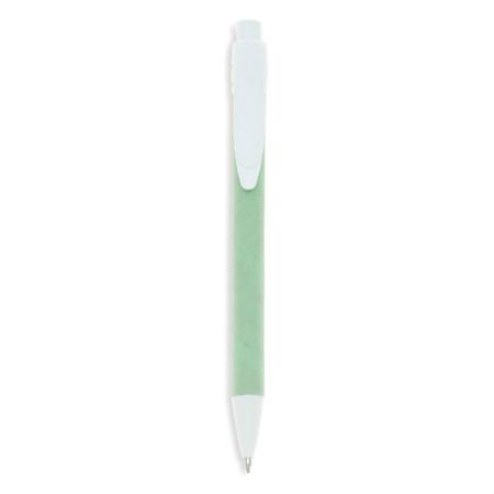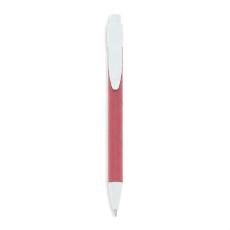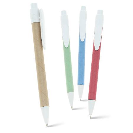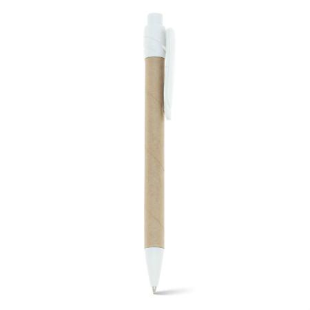Caneta esferográfica com corpo em papel craft, clip de plástico e acionamento através de pressão.