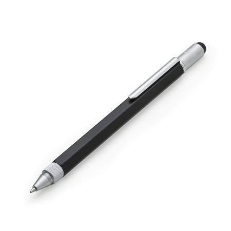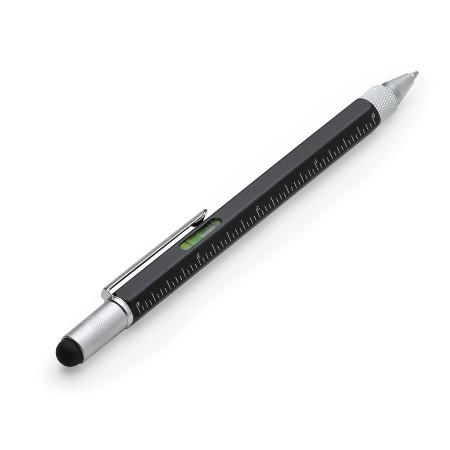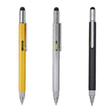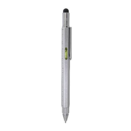 Caneta metálica com touch screen e chave philips, carga esferográfica azul e acionamento por rotação.