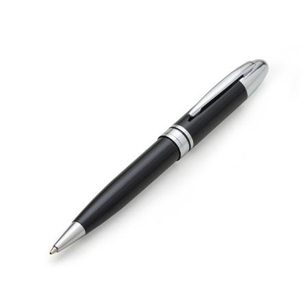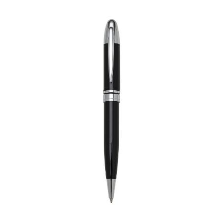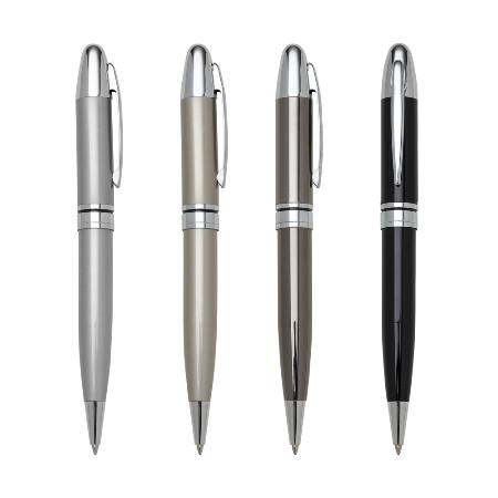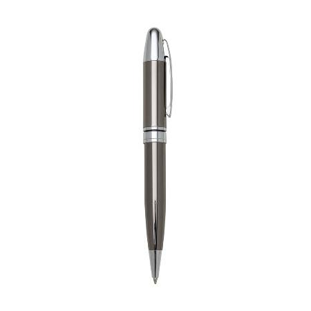 Caneta metálica com carga esferográfica azul e acionamento por rotação.