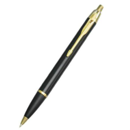 Caneta esferográfica de metal, com corpo preto, detalhes dourados e acionamento através de pressão.