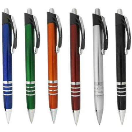 Caneta de plástico personalizada, com corpo colorido e detalhe em quatro anéis prata, cor de tinta em azul e acionamento através de pressão.