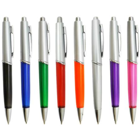 Caneta de plástico personalizada, com corpo prateado e detalhe colorido.