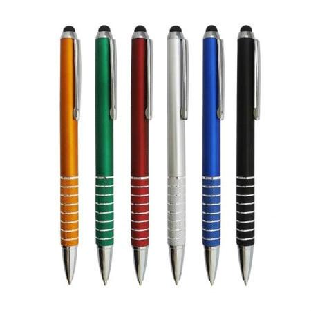 Caneta plástica esferográfica e touch, inteira colorida com detalhes prata. Clip metal, possui oito anéis com relevo na parte inferior. Aciona por clique.