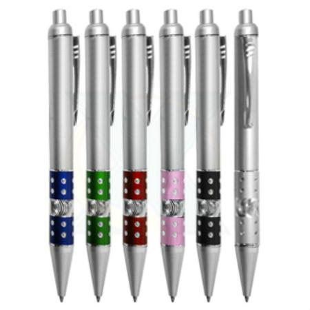 Caneta esferográfica de plástico, com corpo prata e detalhe colorido com brilhante, cor de tinta em azul e acionamento através de pressão.