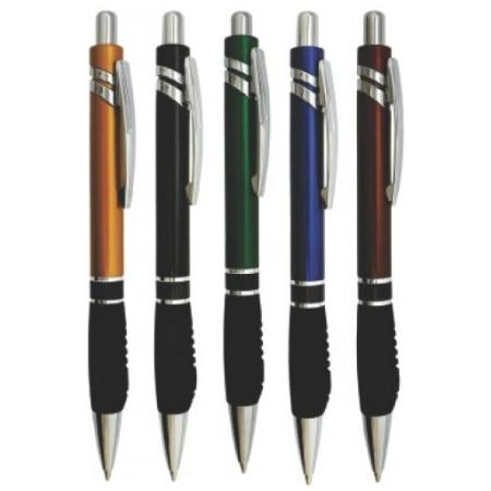Caneta esferográfica de plástico, com detalhe emborrachado, cor de tinta em azul e acionamento através de pressão.