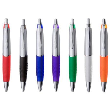 Caneta esferográfica de plástico, com detalhe emborrachado, cor de tinta em azul e acionamento através de pressão.