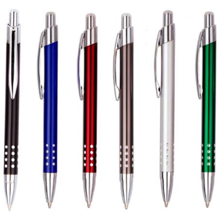 Caneta esferográfica de alumínio, carga azul e acionamento através de pressão.