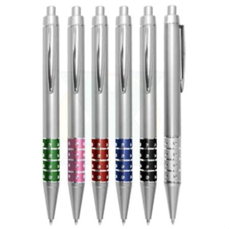 Caneta esferográfica de plástico, com corpo prata e detalhe colorido, cor de tinta em azul e acionamento através de pressão.