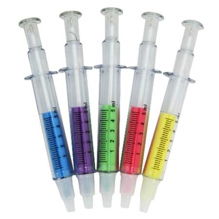 Caneta plástica, em formato de seringa, com dupla função: esferográfica e marca texto.