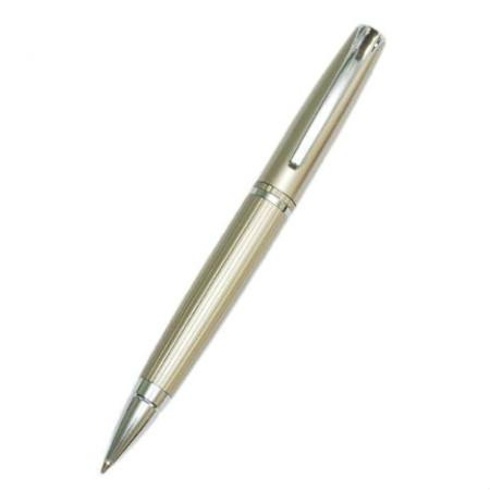 Caneta esferográfica de metal, com detalhes em listras, cor de tinta azul e acionamento através de rotação.