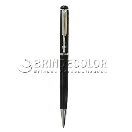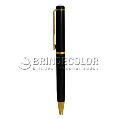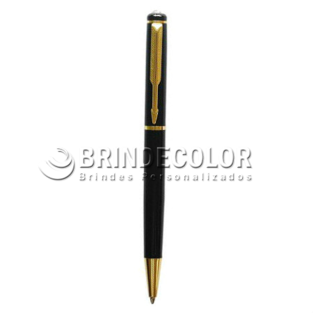 Caneta esferográfica de metal, corpo preto, carga azul e acionamento através de rotação. Opção com detalhes dourado e prateado.