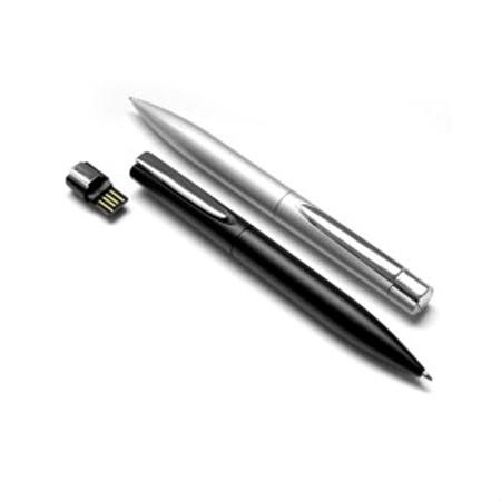 Caneta esferográfica de metal, corpo preto, carga azul e acionamento através de rotação. Também possui pendrive na ponta.