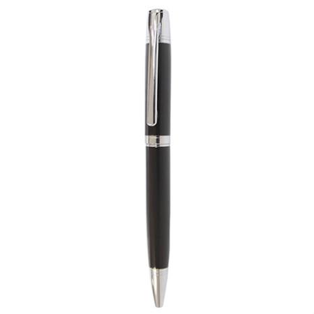 Caneta esferográfica de metal, corpo preto, detalhes prateados, carga azul e acionamento através de rotação.