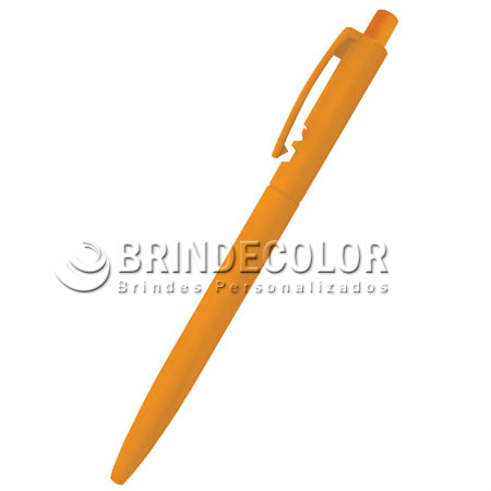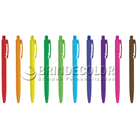Caneta esferográfica de plástico, com corpo colorido, carga azul com 1,5 Km de escrita e acionamento através de pressão.