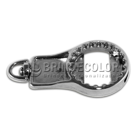 Chaveiro abridor em metal Zamak, banhado em níquel, com argola.