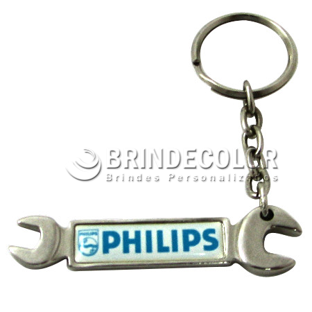 Chaveiro formato chave de boca em metal Zamak banhado em níquel, com argola e corrente.