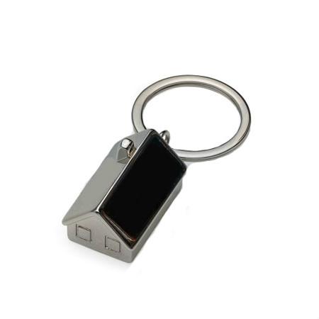 Chaveiro metal brilhante e fosco formato casa em 3D, possui janelas em relevo e chaminé. Parte inferior com chapa inox ideal para personalização.
