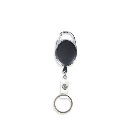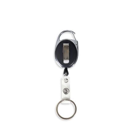 Chaveiro estilo mosquetão retrátil com porta crachá. Feito de metal e PVC. Acompanha argola em inox para chaveiro e suporte transparente para crachá com botão de pressão. Possui um clip atrás para pendurar.