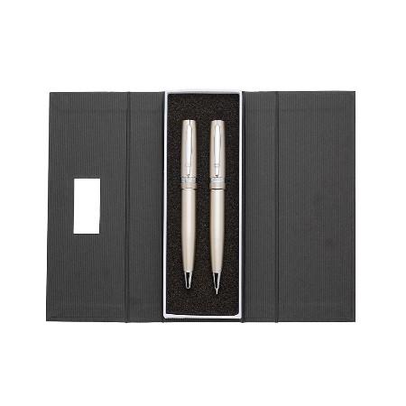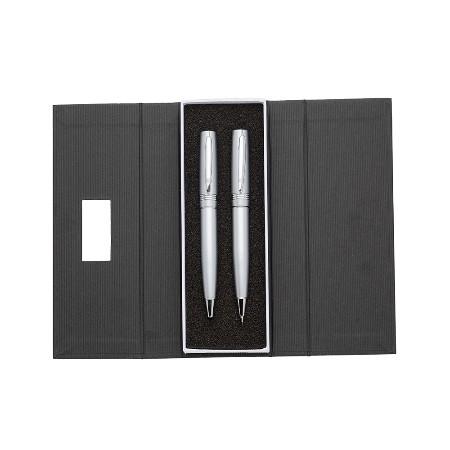 Conjunto caneta e lapiseira em estojo de cartonagem com placa central para personalização. Caneta/Lapiseira metal inteira colorida com detalhes prata, clip metal com duas “linhas” e na “ponta” superior detalhe de uma linha no meio. Possui três anéis abaixo do clip, anel centralizado e anel inferior e acionam por giro. Estojo revestida com espuma na parte interna.