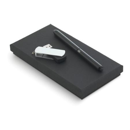 Conjunto caneta touch e pen drive. Esferográfica NEO em alumínio com ponteira touch em silicone. Pen drive em ABS com clipe em alumínio.