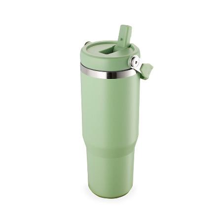 Copo térmico inox com a capacidade máxima de 800ml. Apresenta estrutura em parede dupla, tampa plástica rosqueável com vedação a vácuo com alça fixa em inox e uma camada em plástico, além de bico flexível. Acompanha canudo plástico para encaixe interno.