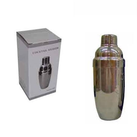 Coqueteleira de inox com capacidade para 750ml, contém tampa de pressão com peneira e tampa protetora.