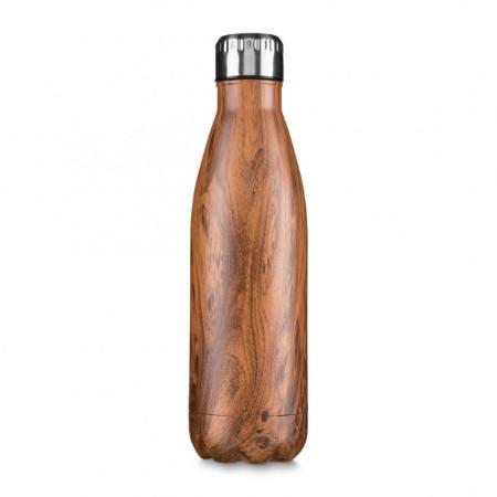 Garrafa 750ml em inox com tampa rosqueável e pintura com simulação de madeira. Obs.: Não é um modelo térmico.