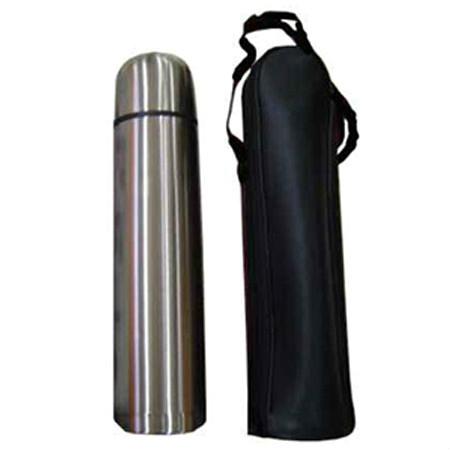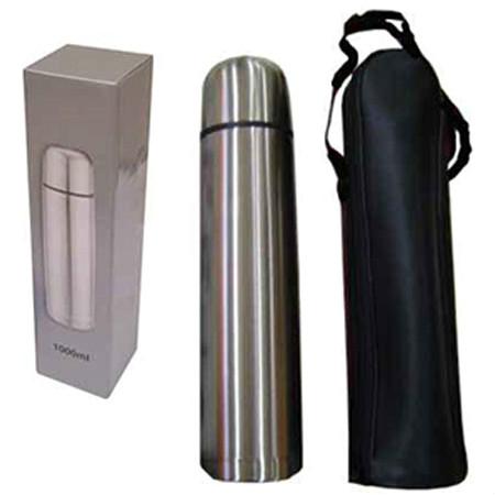 Garrafa térmica de inox com capacidade de 1 litro, com embalagem em couro sintético.