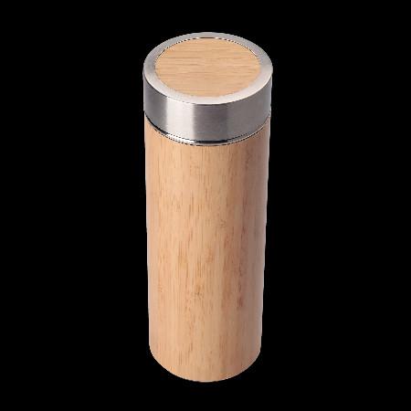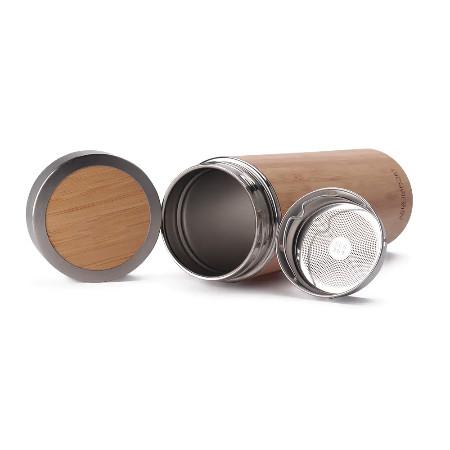 Garrafa térmica em aço inox com parede dupla isolada a vácuo com capacidade de até 400 ml. Com revestimento externo em fibra de bambu e infusor para chás. Tampa rosqueável e anel de silicone para vedação. Conserva líquido quente por até 12 horas e líquido frio até 18 horas.