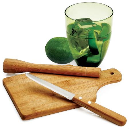 Acompanha tábua em bambu, faca para frutas 4" em inox/bambu, pilão em bambu e copo de vidro.