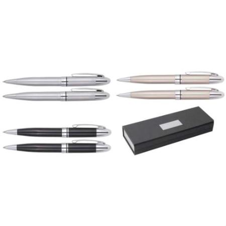 Conjunto de caneta e lapiseira em estojo de papelão resistente.