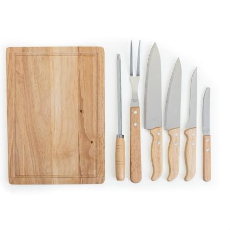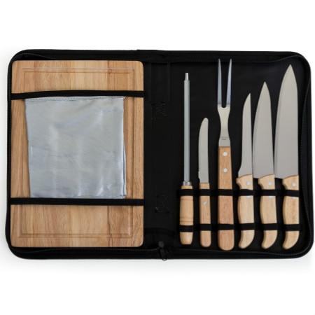 Kit para Churrasco 8 peças com cabo em Bambu, laminas em aço Inox e avental. Acompanha tábua em bambu com canaleta, 3 facas de corte e uma faca de serra cabo, chaira, garfo, e avental com bolso na cor prata. Acomodados em uma maleta em nylon preta, costura com zíper . Rebites em Aço Inox, um dos mais resistentes à ferrugem e corrosão.