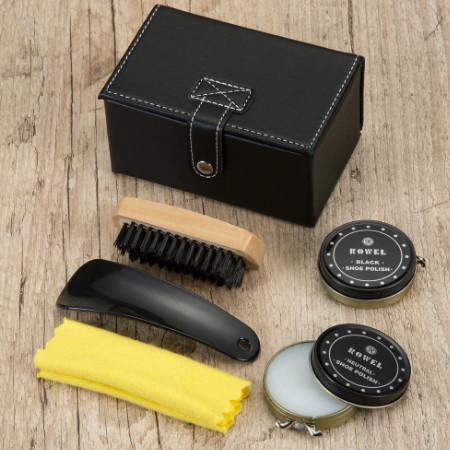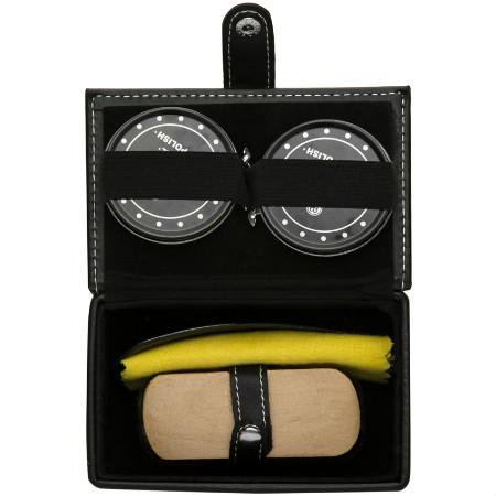 Kit engraxate estojo em couro sintético com 5 peças, costura branca e botão para abrir/fechar. Possui cera preta, cera incolor(suporte da cera em metal, para abrir basta girar a trava), calçadeira, flanela amarela e uma escova(acompanha proteção plástica). Parte interna com dois elástico para encaixar as ceras e suporte com botão para prender a escova.