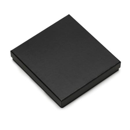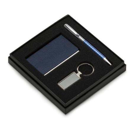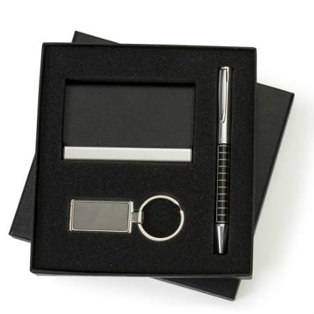Descrição: Kit executivo com 3 peças em estojo preto de papelão revestido com espuma interna. Possui: caneta metal prata com detalhes coloridos e quadriculados, clip metal com anel superior na ponta e dois anéis centrais(aciona por giro); porta cartão em couro sintético texturizado com detalhes em metal(detalhes em metal externos espelhados e internos escovados e parte interna com veludo) fecha por imã; chaveiro metal retangular com chapa espelhada(fumê) e parte traseira texturizada.