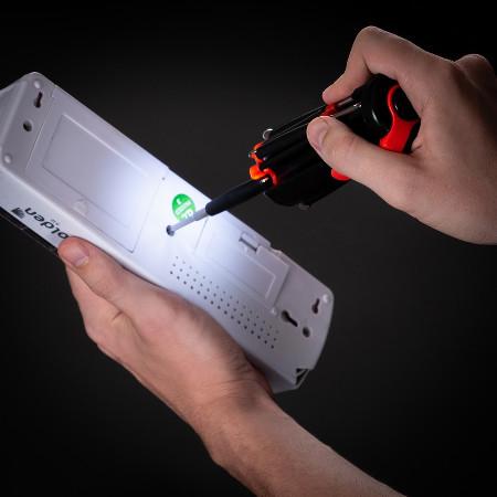 Kit ferramenta retrátil com 7 chaves e lanterna de 6 Leds. Material plástico, possui 3 chaves Philips; 3 chaves de fenda; chave de ponta dupla sendo um mini Philips e uma mini Fenda em cada extremidade, basta desrosquear as tampas para visualizá-las. Clip vermelho com setas explicativas para abertura do compartimento de pilhas, pressione a localização da seta superior e empurre ao mesmo tempo a parte inferior para remoção, necessita de 3 pilhas AAA(não acompanha).