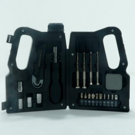 Kit ferramenta 21 peças em estojo formato garrafa de óleo.