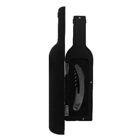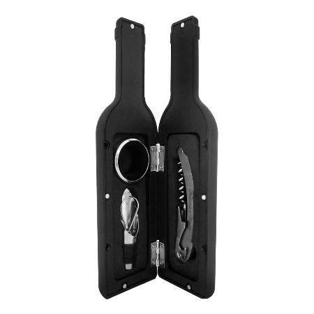 Kit vinho com 3 peças, estojo de plástico resistente no formato de garrafa.