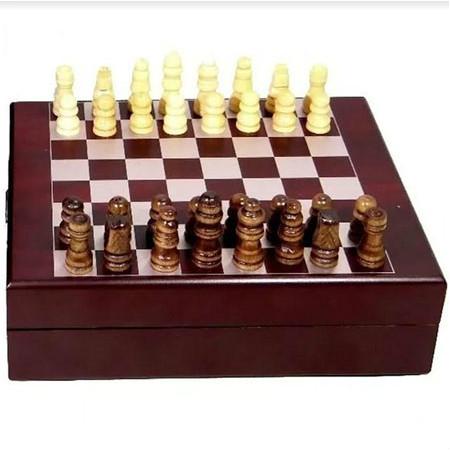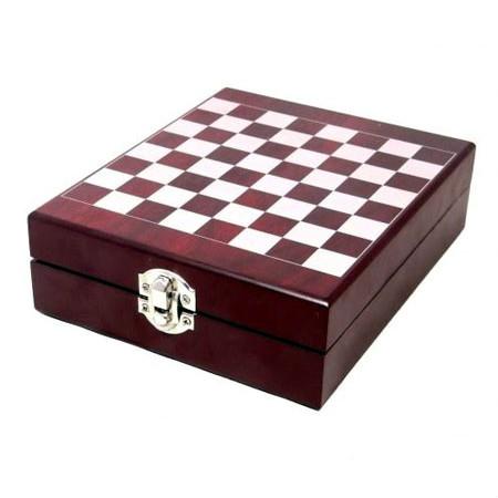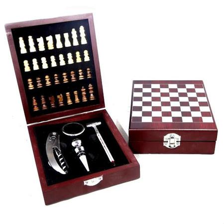 Conjunto para vinho com jogo de xadrez, compõem o kit , 1 anel de gargalo, 1 tampa de metal para garrafas de vinho, 1 saca rolhas com lâmina, 1 martelinho com termômetro, mini jogo de xadrez com peças em madeira, 1 estojo de madeira.