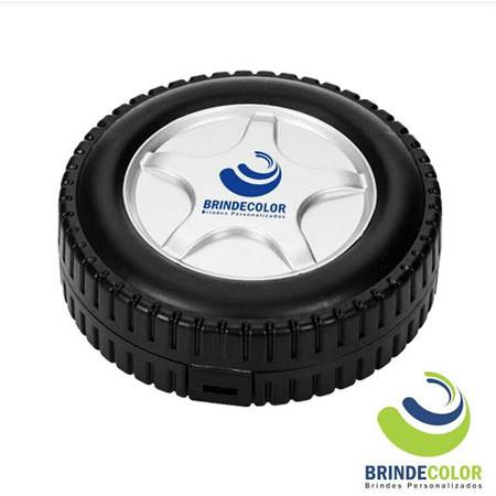 Kit ferramenta 20 peças com estojo formato pneu em plástico resistente. Pneu preto com aro prata, possui trava lateral.